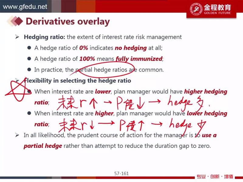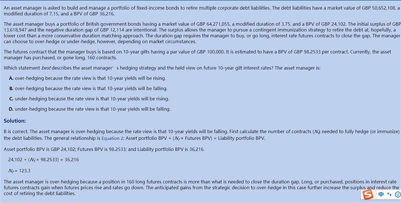 老师能帮看下这道题我的思路对不对吗?就是要去还的公司债liability duration大(7.15) 现在全是国债的portfolio duration小(3.75) 现在情况下算出来用124份期货就行 ,但是如果后面利率下降 负债和现在portfolio金额都要增加 但是负债duration大 所以增加的金额会比portfolio的多,所以中间差距就会变得更大 ,所以就提前先买更多的期货合约 多出了40 现在就hedge 就是为了担心利率下跌时候 差距变得更大 成本更高?