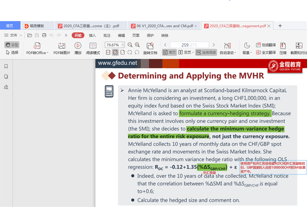 这个题目我还是不明白,回归的是RDC和RFX之间的敏感度关系,beta是衡量这个两个return之间的敏感性的,和long1000000 CHF与short 1350000 GBP/CHF之间有什么关系?怎么知道long1000000的CHF SMI资产需要多少GBP/CHF的spot rate去做对冲?