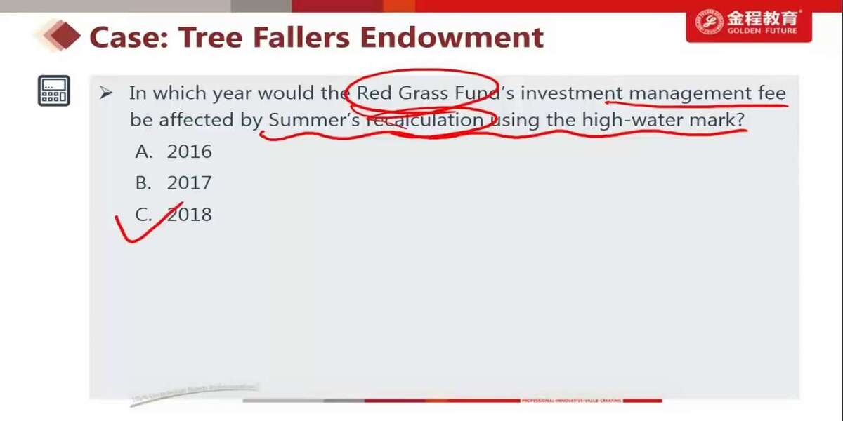 比较简单的做法,直接用5%-2%在减去base fee,得到2%, total fee =1%+2%*20% =1.4%。 还有一种比较精确的做法,因为考虑了复利。 2016年的收益是8%,在2017年,累计收益率降到了(1+8%)*(1-2%)-1= 5.8%. 到了2018年,虽然收益率为5%,但累计收益为(1+5.8%)*(1+5%) -1= 11.11%。因此高水位就是前面2016年的8%,只有11.11%-8% = 3.11%的部分可以用于计算绩效奖金。又因为red grass计算sharing时要扣除base fee,因此total fee = 1%+20%*(3.11%-1%)=1.422% 这两种算法如何取舍呢?