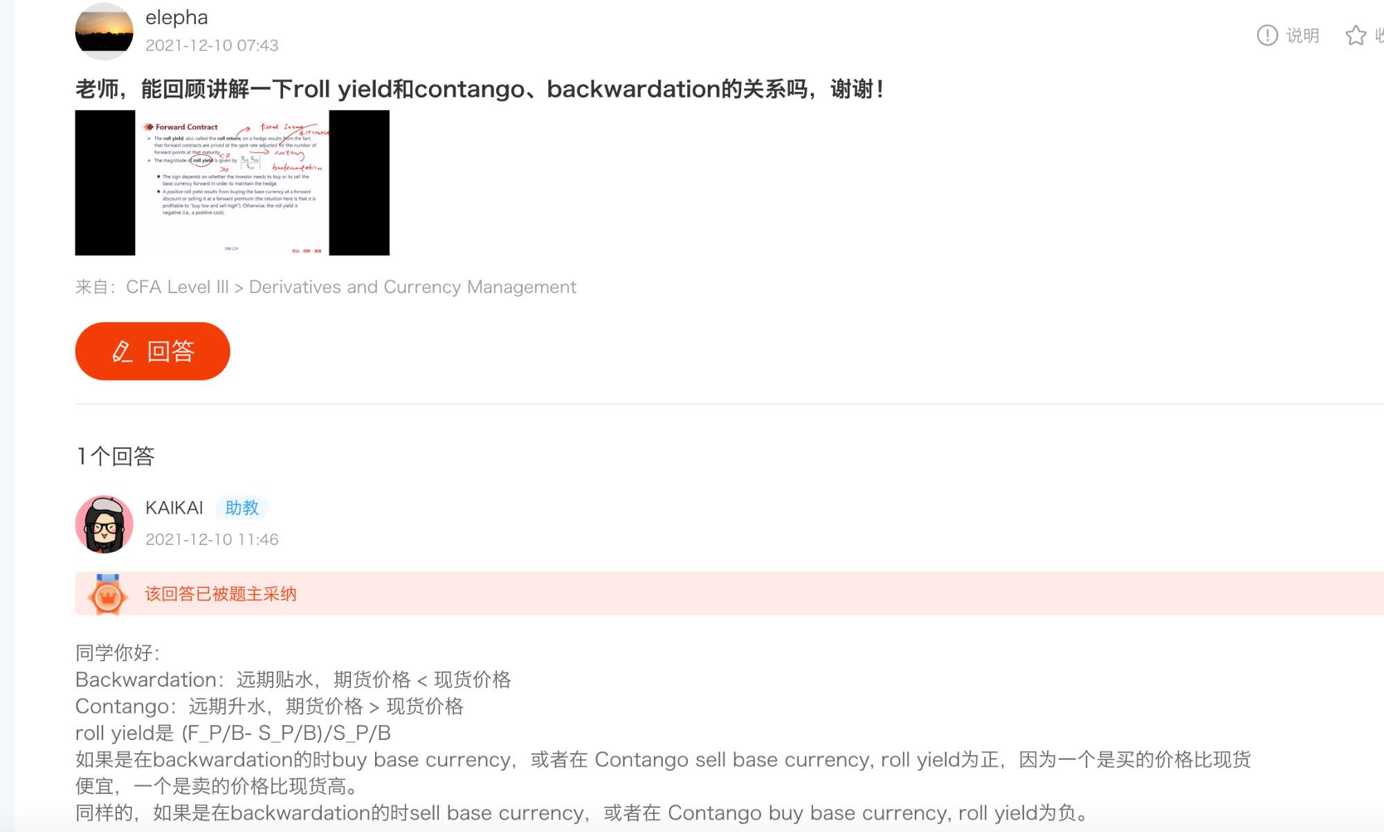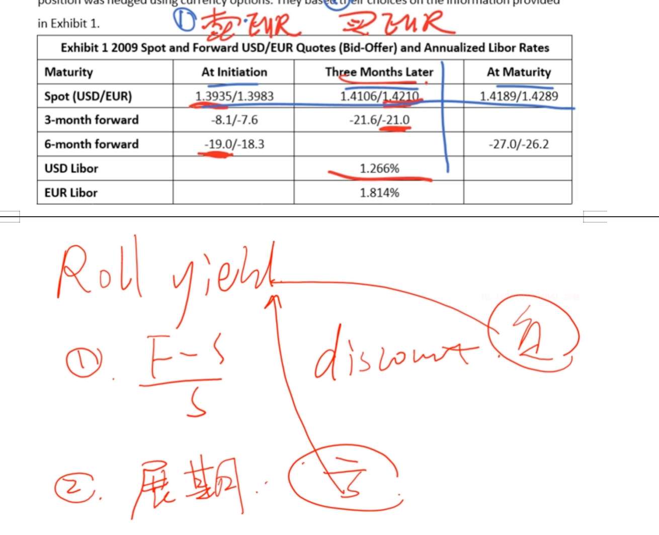 已回答第三题,问roll yield正负的时候,老师用了红框里的数据,EUR是升值。但这里是short EUR啊,EUR如果越来越贵,不是说明short卖得更贵,因此是有正的roll yiled么?不知道哪里理解错了
