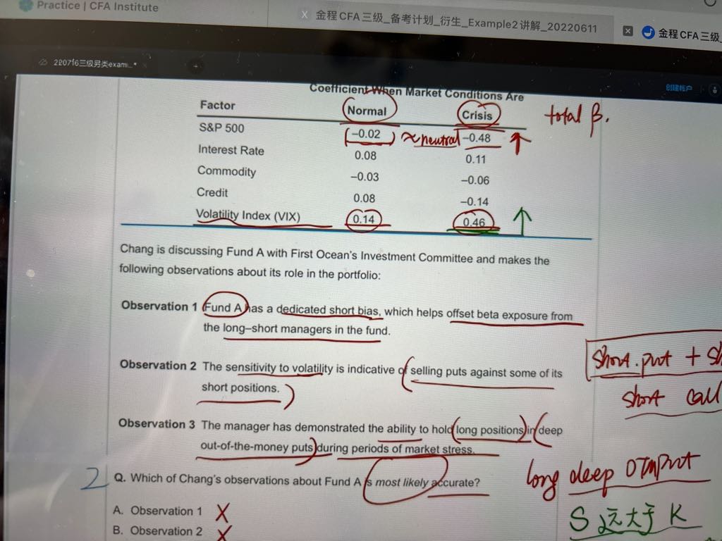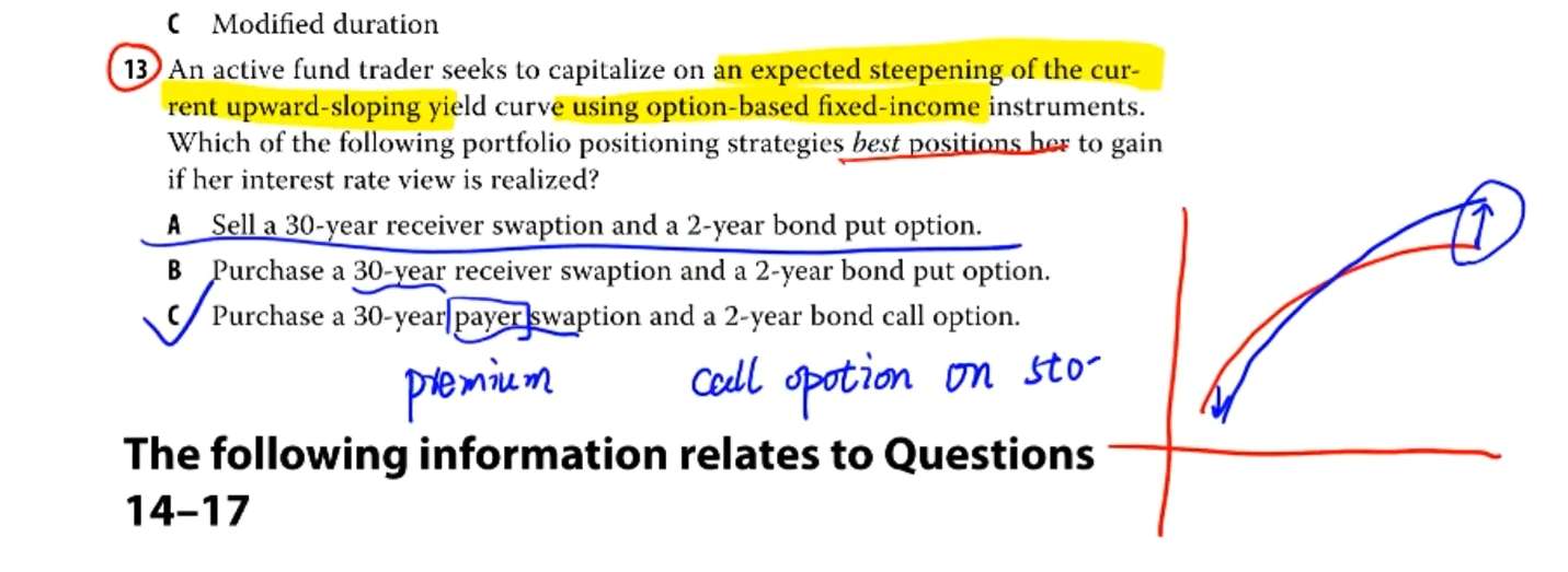 不知道这个解题思路哪里错了:这里短端利率是下降的,说明债券价格上升,应该选短端能增加久期的选项。答案C中long两年的bond call option,随着债券价格上升会行权,行权后久期是缩短不是增加。还请老师看看