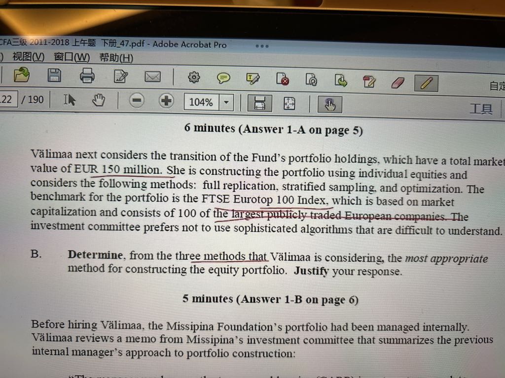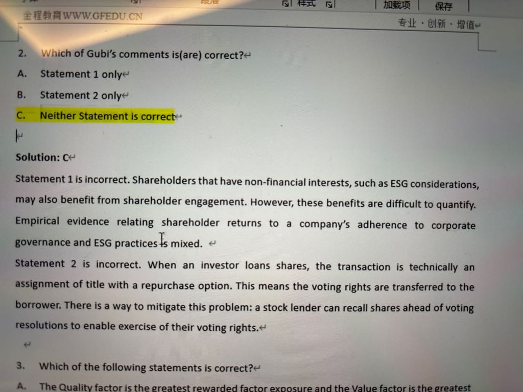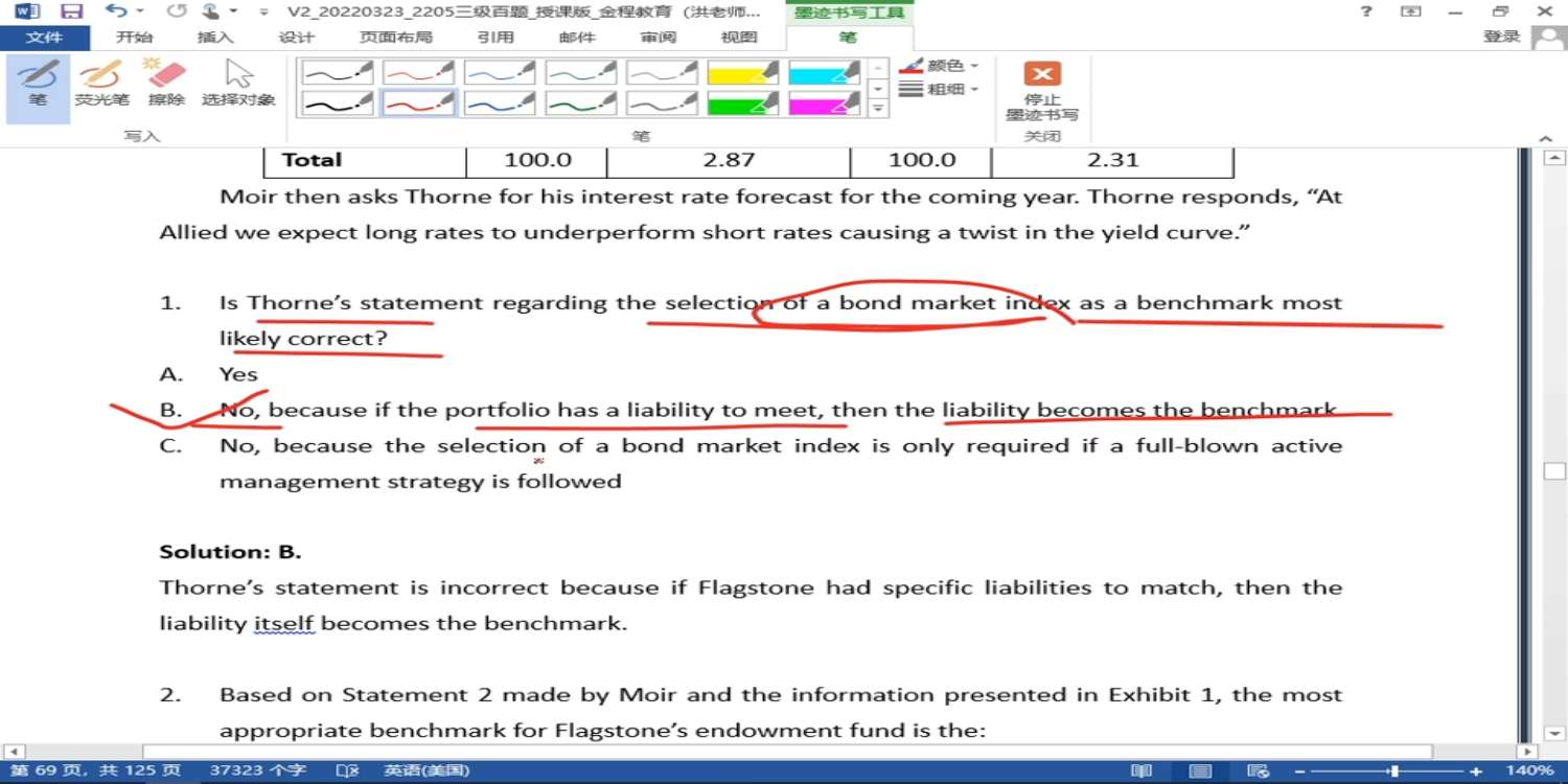 查看试题 已回答这道题感觉bob讲错了,奖学金准确来说属于Quasi-liabilities,which are not legal liabilities; 题目中Thorne responds: “Irrespective of whether you have specific liabilities to meet, a bond market index must be selected that will serve as a benchmark.”这句话意思是无论是否属于负债,都应该选benchmark,是这句话本身的意思错了,而不是像bob说的奖学金属于负债,所以要用LDI,我的理解对吗?