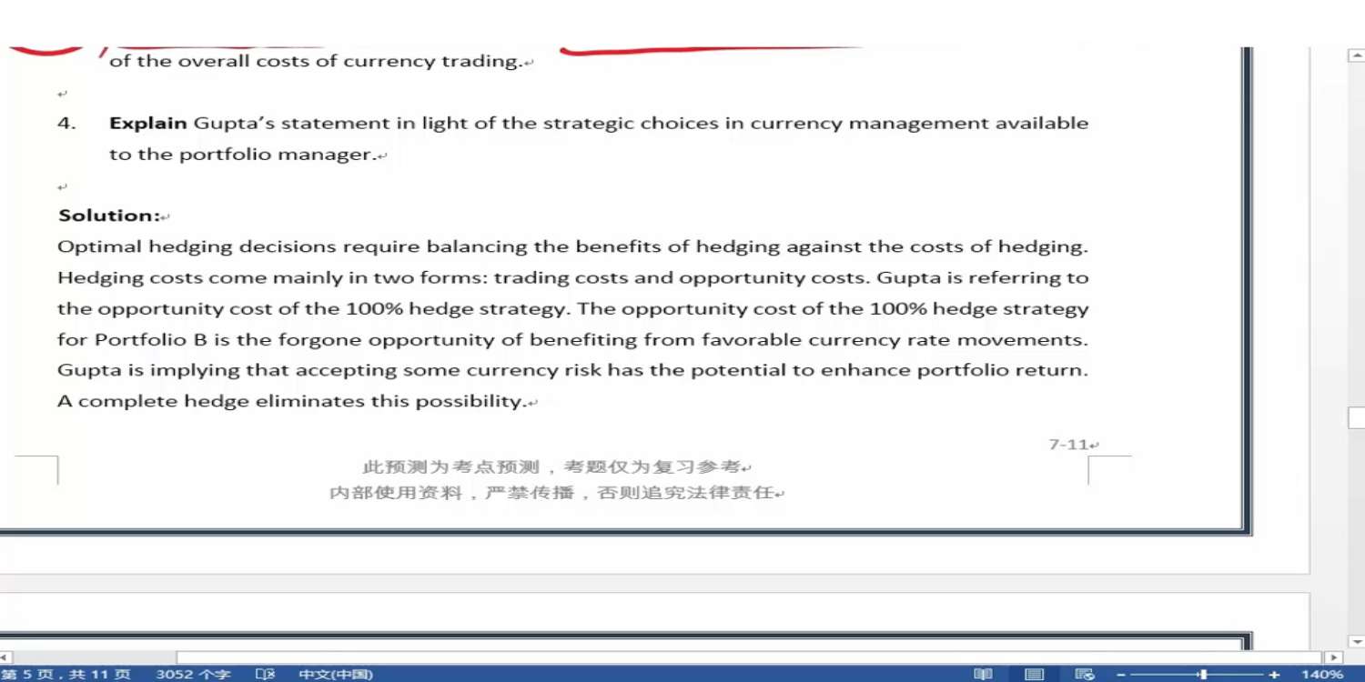 前两题我回答的时候没有列出解析里的公式,但还是把这些return的关系说明了一下可以吗?1. USD is depreciated. The return in GBP is 15% that is lower than 19.5% denominated in USD. It means extra return is realized in currency conversion due to depreciation in USD. 2. The foreign-currency return is negative. Since EUR appreciated 5% relative to USD and portfolio B holds assets denominated in EUR, the portfolio return in USD is supposed to be at least 5% if foreign-currency return is not negative. However, the actual return in USD is 0%, which indicates negative return in foreign currency.