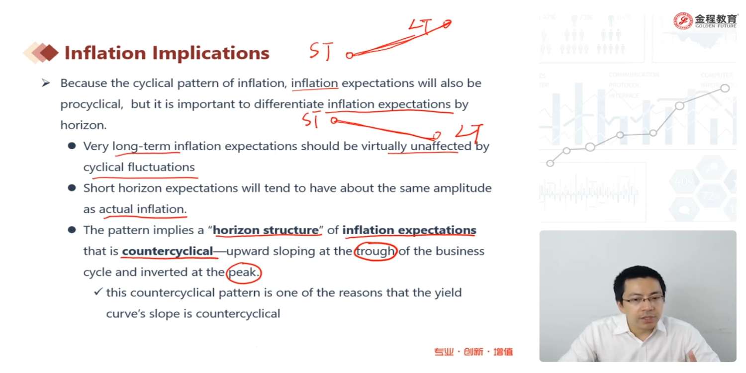请问Because inflation expectations are an important component of bond yields, this countercyclical pattern is one of the reasons that the yield curve’s slope is countercyclical.是什么意思,能画图解释一下吗?