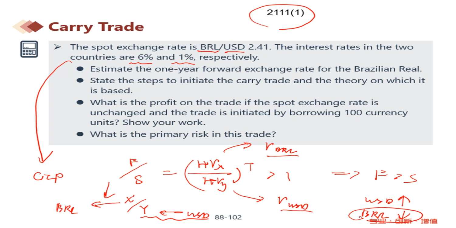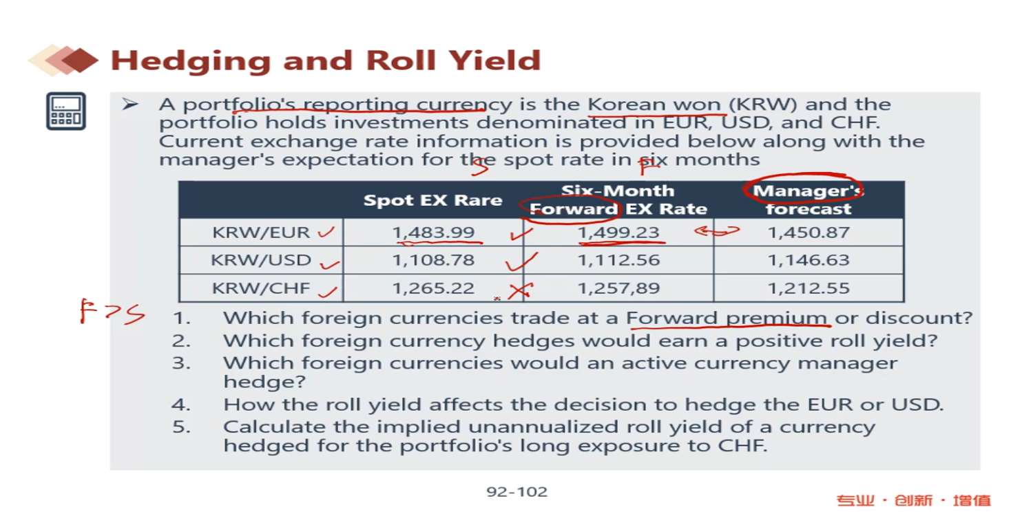 这个地方的positive roll yield, 2级讲的不是说如果做多,远期升水,roll yield为负,因为相当于花更多的钱买新的合约。应该没有理解错吧? 第一问,F>S,的是分母货币升职,远期trading at premium. trading at premium 的是远期升水,应该是负的roll yield吧 视频中老师说和第一题答案一样