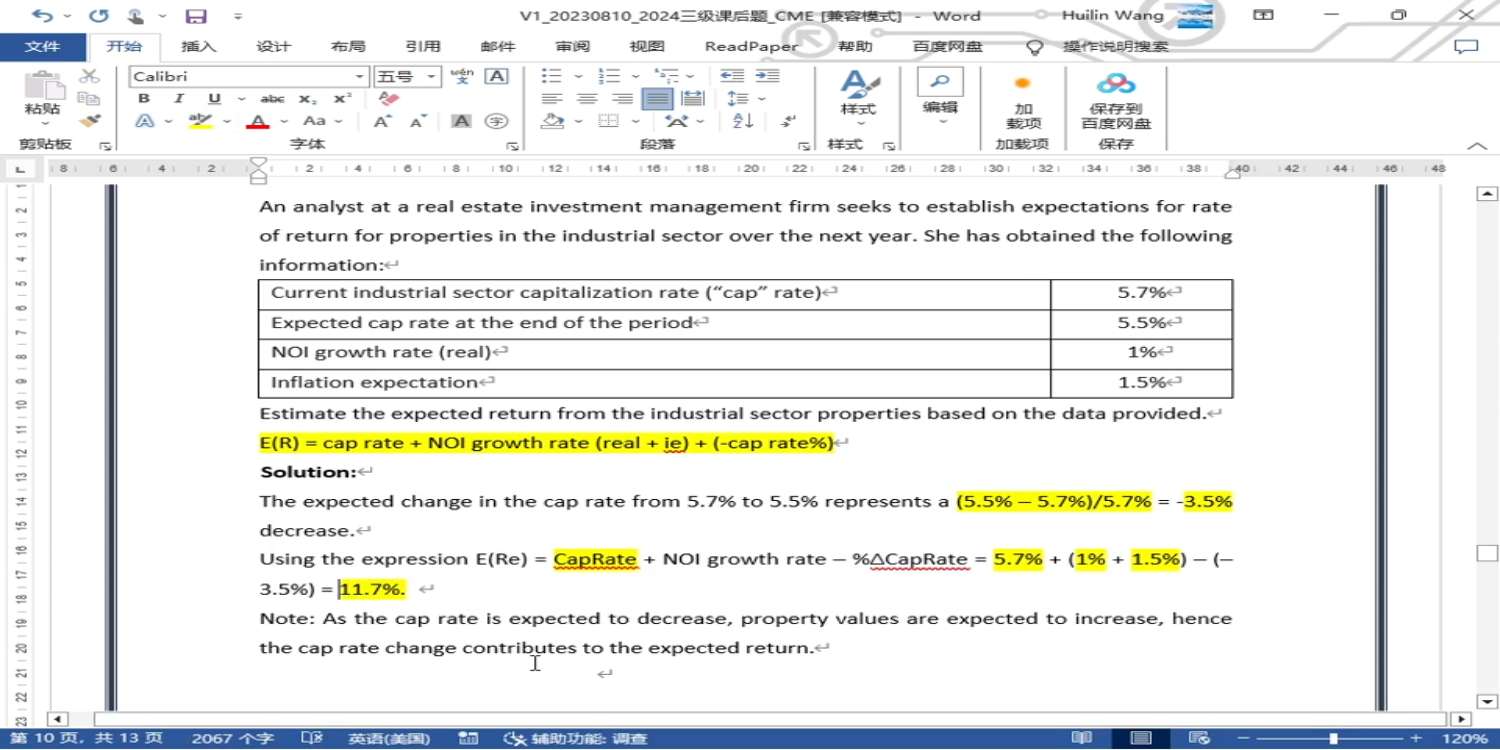 cap rate变化3.5%为啥能直接加在总预期收益率上呢