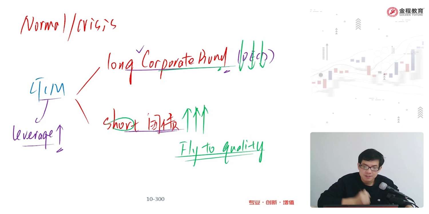 老师这里说的在crisis时,govt bond价格上升和corp bond价格下跌都是针对自身在normal market时的价格对吗? 而strategy initial position long corp bond 和short govt bond 的原因在于corp investment bond has relatively low price and high yield,govt bond has relatively high price low yield 对吗?