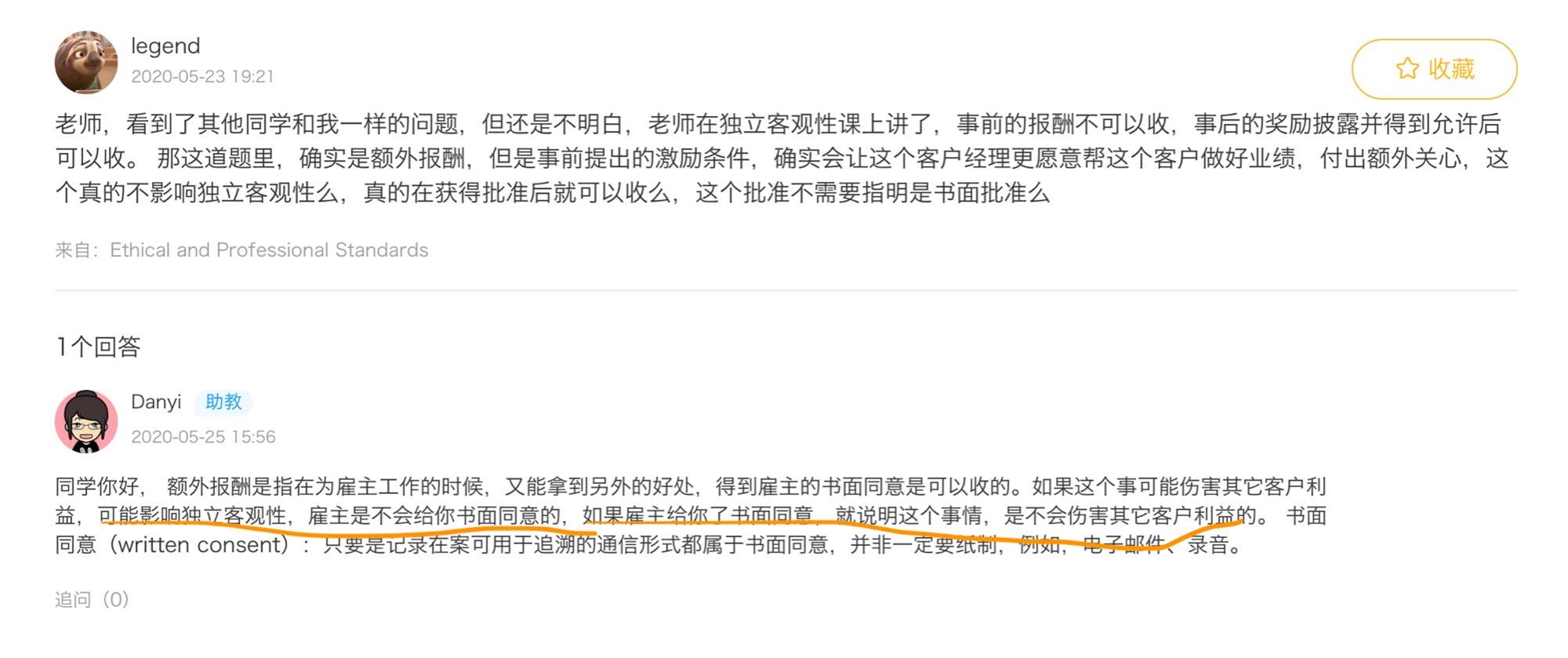 追问一下这个问题。之前就有一个case是在独立客观性的case13里,Adrian在事前接受了贿赂,同时公司也同意了,老师当时说是以公司形式的贿赂。这题里不能因为雇主同意了就认为对客户没影响吧
