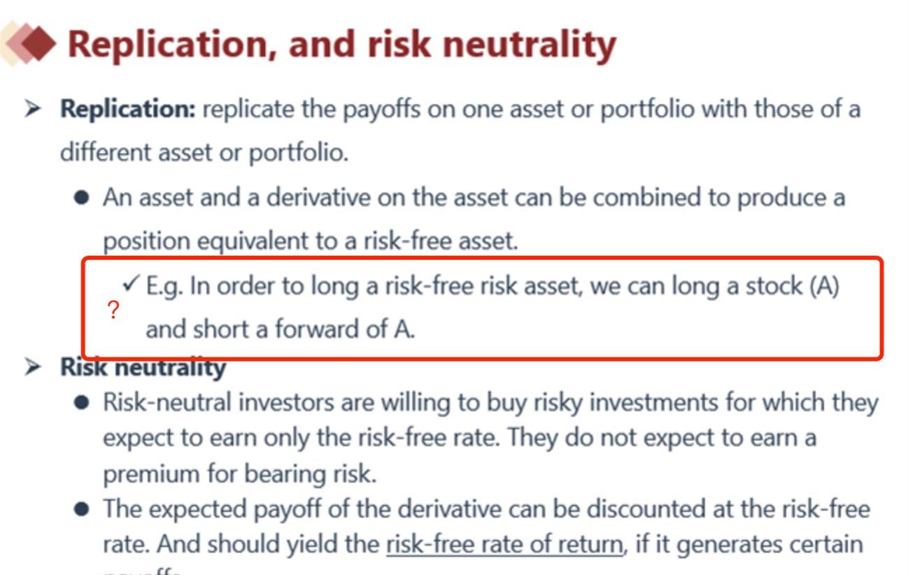highlight处关于利用衍生品做风险对冲,我能否这么理解:$10买入一只股票,担心未来股价有下跌的风险,所以现在就签订一个short forward远期合约,并约定好未来以某个价格如$10卖掉这个合约,如果合约到期时候刚好股价也下跌了,不赚不亏,就能达到Rf bond的效果?
