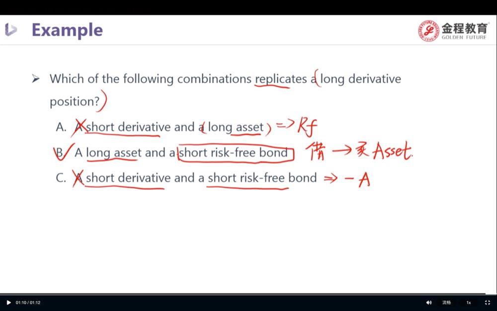 1. 完全不理解这个题目,公式Asset+Derivative=Rf Bond,没有说Derivative的符号是正是负,等号两边应该怎么左右移动这个公式?所以老师对AC的讲解,是怎么得出他的结论的呢?2. 怎么通过公式得出B答案的?是直接忽略Derivate的符号,只需要看Asset和Rf Bond的符号吗?