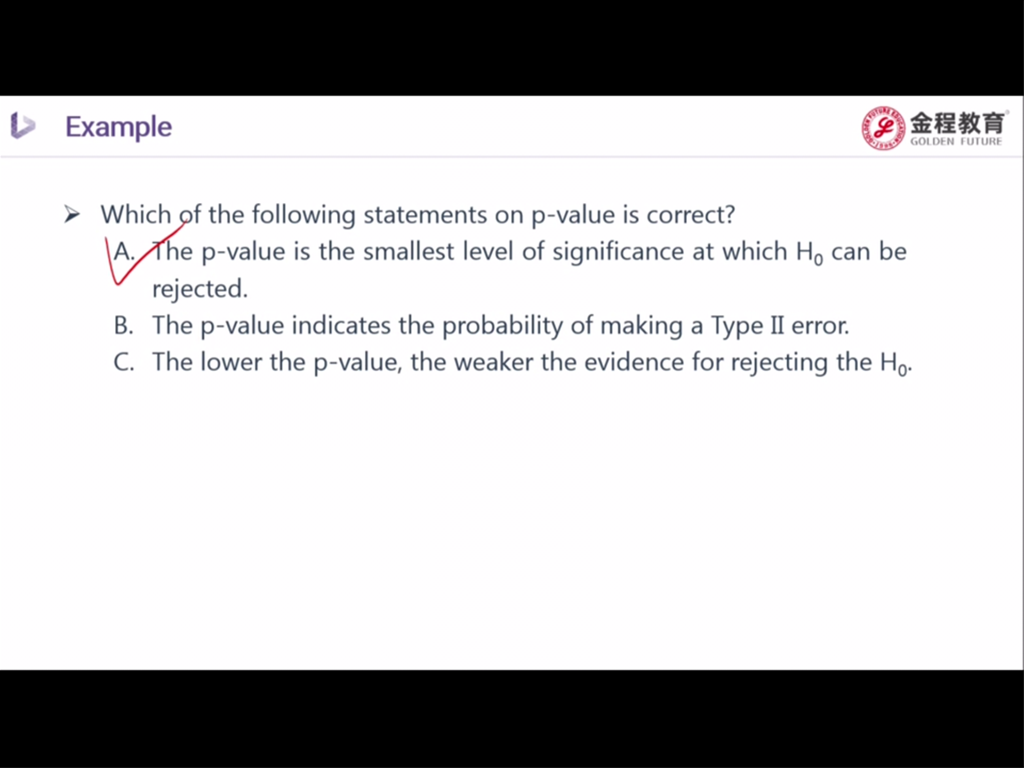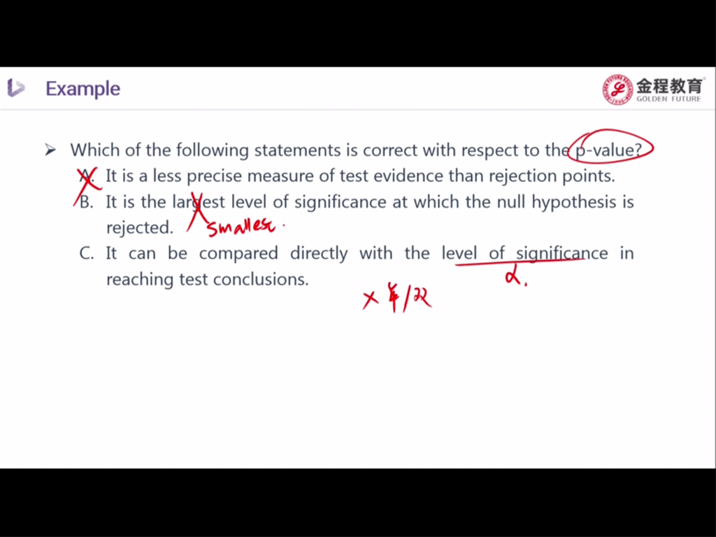 老师,这里B选项如何理解,麻烦具体说一下。P-value是拒绝域的面积,它和阿尔法之间的大小关系如何使用?
