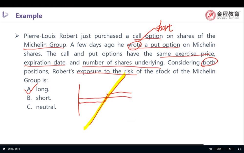 这题能否这样理解:long call和short put,一个是有权利买入一个资产,一个是有义务买入一个资产,总体来说是买入一个资产,所以说是long position?