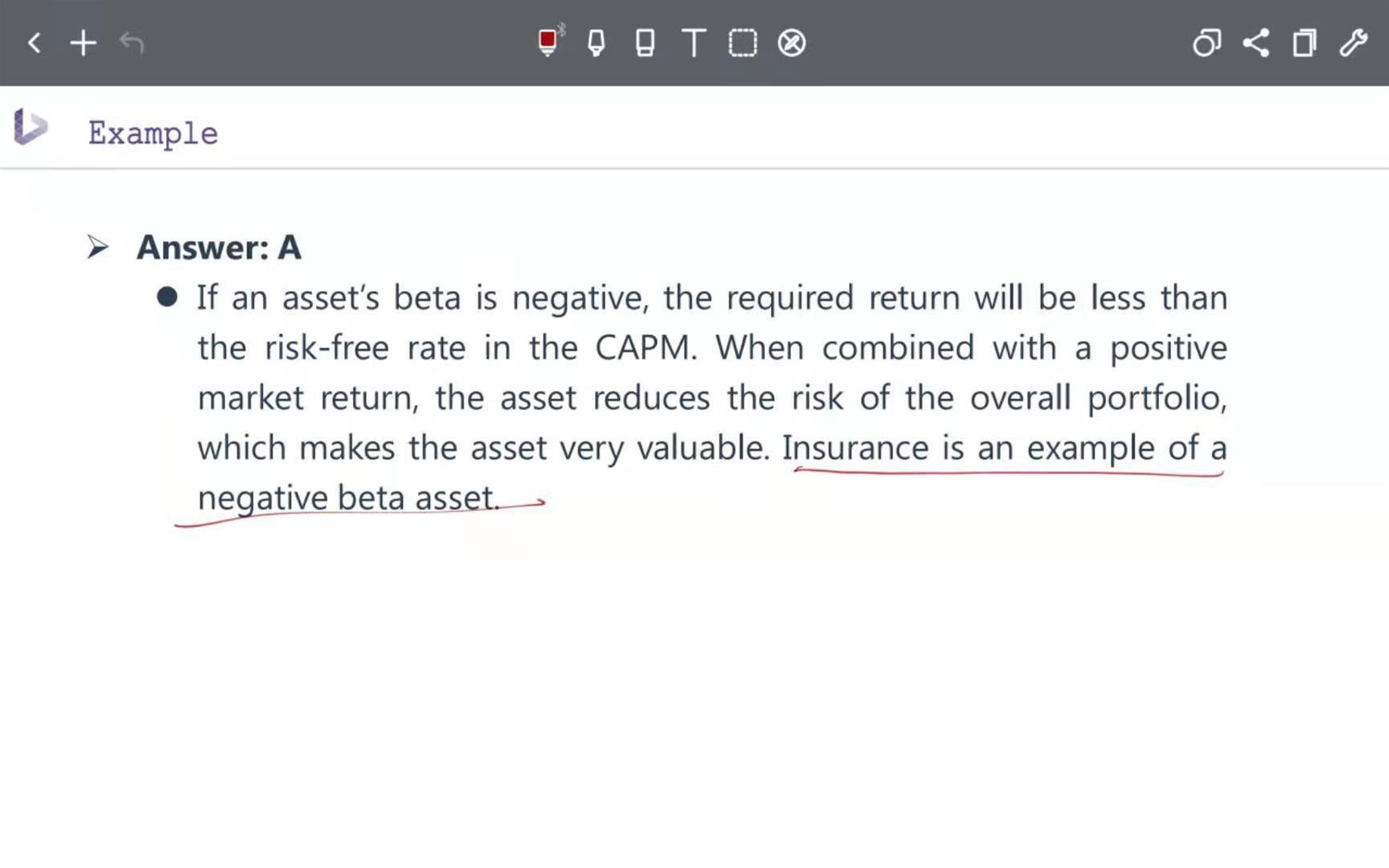 老师ppt174页的答案解析第二句话我不是很理解(when combined with a positive market return, the asset reduces the risk of the overall portfolio, which makes the asset very valuable) 另外为什么说insurance的beta是negative的呢?