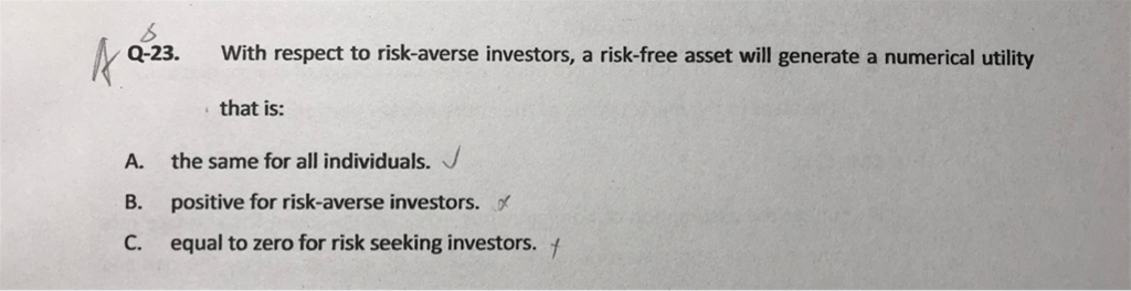 关于无差异曲线相关概念想问下老师: 1、当组合方差为零时,所获得的收益率一定是无风险收益率吗? 2、如果第1问不成立,那我们通常所说的“无风险资产的收益率是无风险收益率”是指什么情况下成立的? 3、无差异曲线和Y轴的交点对应的是当方差为0时的收益率,各个无差异曲线和Y轴的交点并不是同一点的原因是否为:方差均为0的不同组合,他们的收益率也不一定相同? 4、图中题目不选B的原因,是因为无风险收益率也可能为负吗?