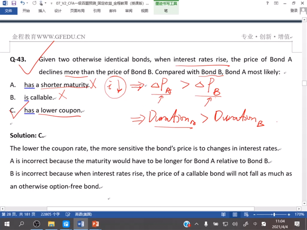 老师您好,callable bond有利于issuer,所以价格一般较低,当interest rate更高时,callable bond不应该更便宜吗,B不可以选吗