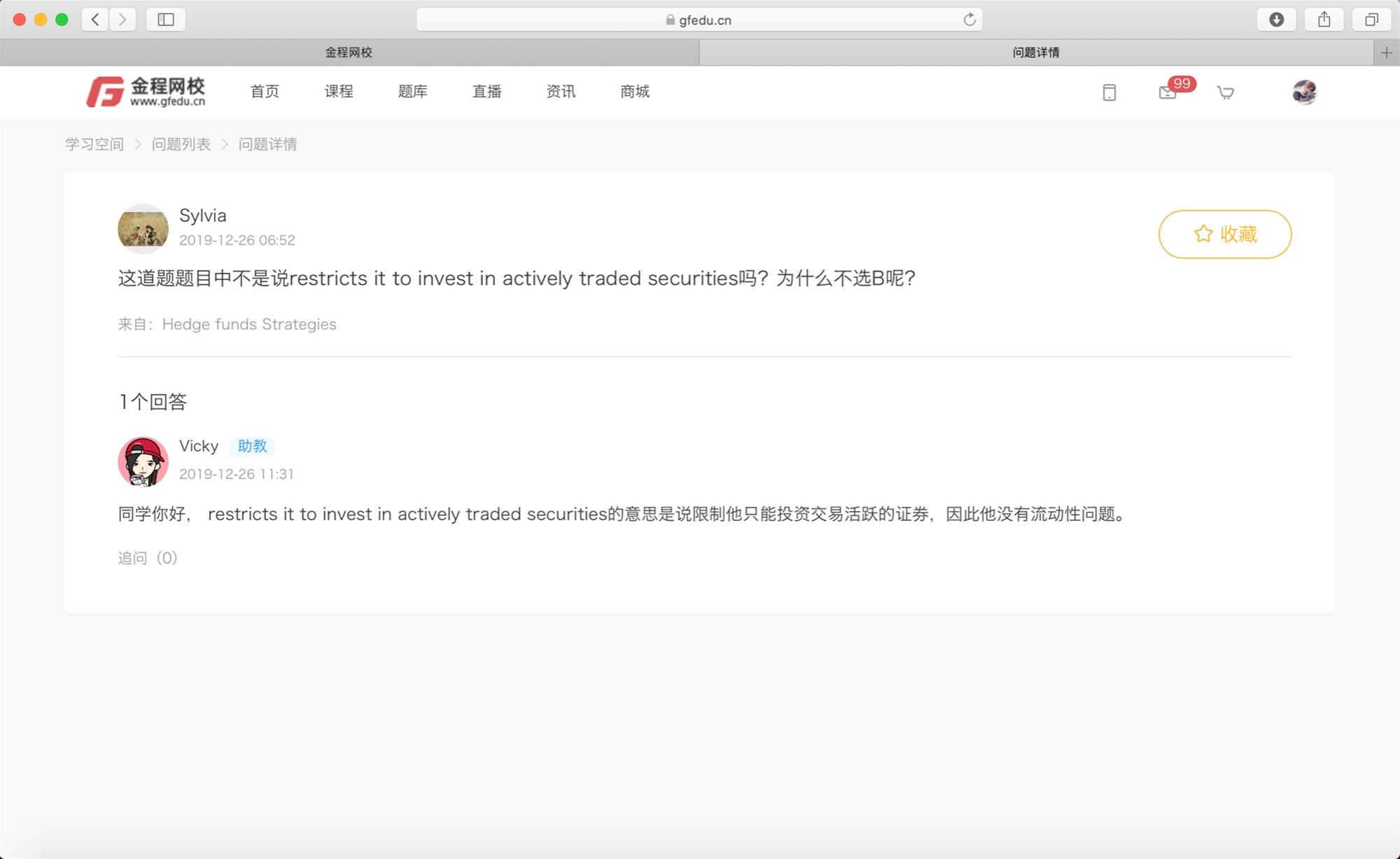 CFA问答包含CFA在线课程、CFA通关课程、CFA试题等所有CFA相关问题,每个问题老师均会在24小时内给出答疑回复哦!
