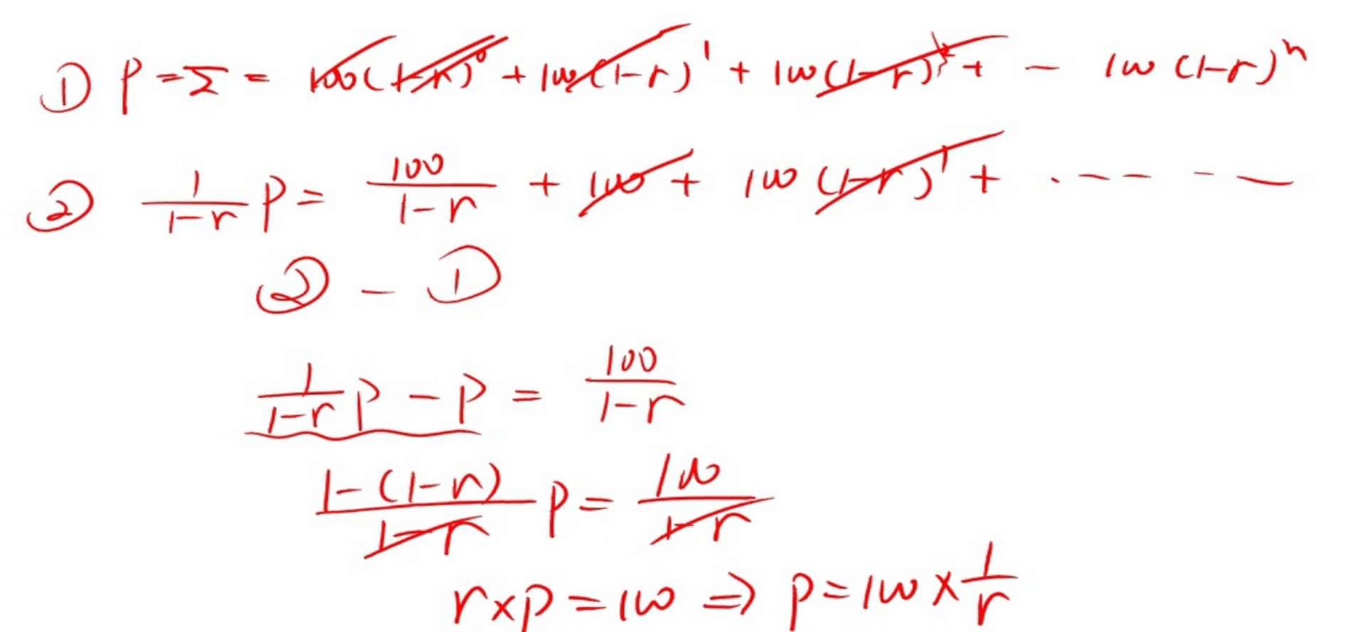 因为2式当中左右除以1-r则最后一项为100x(1-r)的n-1次方,此处2式减1式,1式中最后一项100x(1-r)的n次方怎么没了,应该约不掉不是吗?