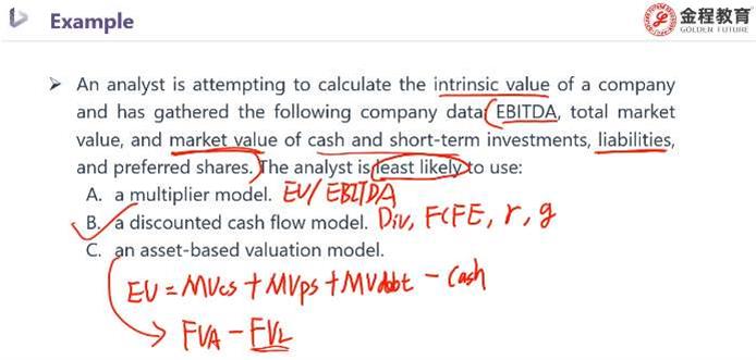 请问老师之前不是说负债的账面价值不能替代其市场价值吗?那为什么在这道题 中asset-basedmodel中FVL的账面价值又可以代替市场价值了呢?