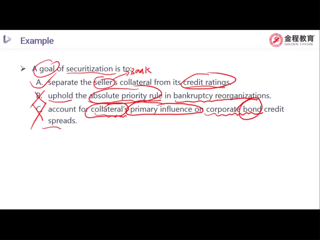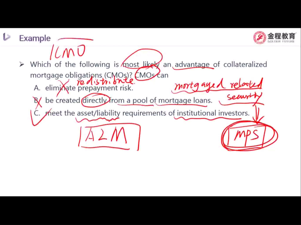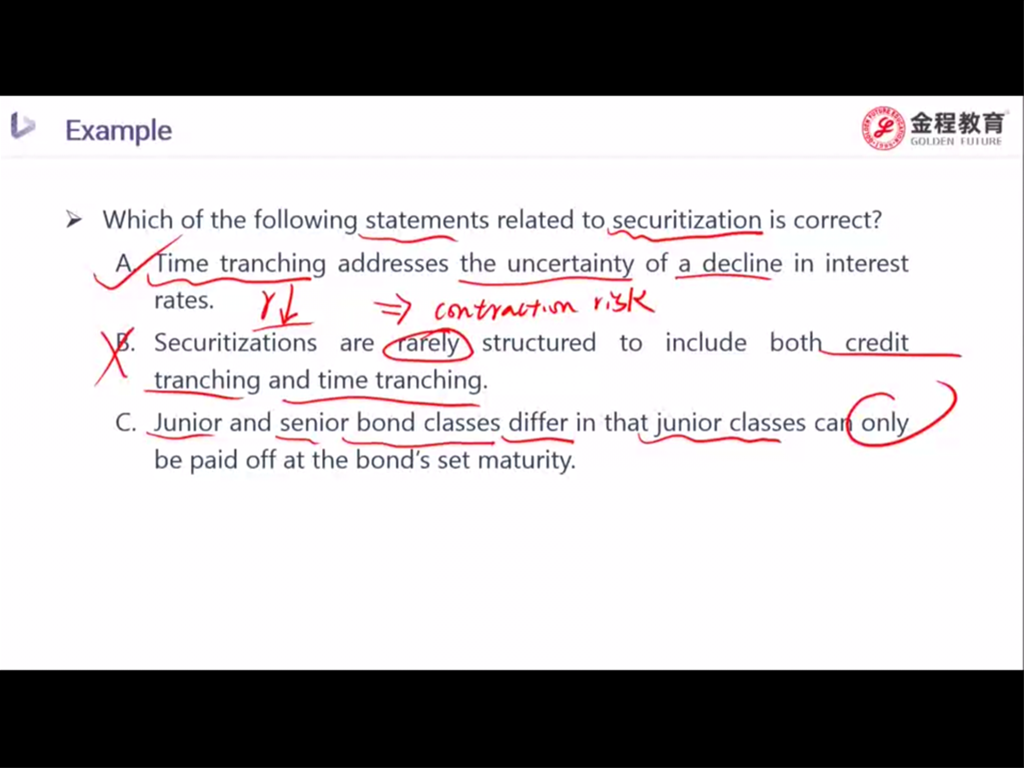 固定收益 经典题 P259,老师这道题A选项意思是如果预计利率下行,那投资者可以买 time tranching的最下面那层,即还款最久的那个,来解决这个问题,是吗