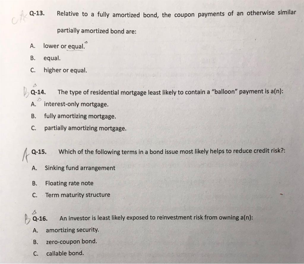 有以下问题想问老师: 1、对于图中的13题: (1)部分摊销债券在到期日会支付部分本金,那么每期支付的现金应该比完全摊销债券少才对,为什么会选C呢? (2)什么情况下会出现equal? 2、对于图中的14题,balloon payment是否指到期日支付的本金?到期日支付所有本金可以称为balloon payment,支付部分本金也可以称为balloon payment对吧? 3、对于图中的16题,A选项的再投资风险指什么?