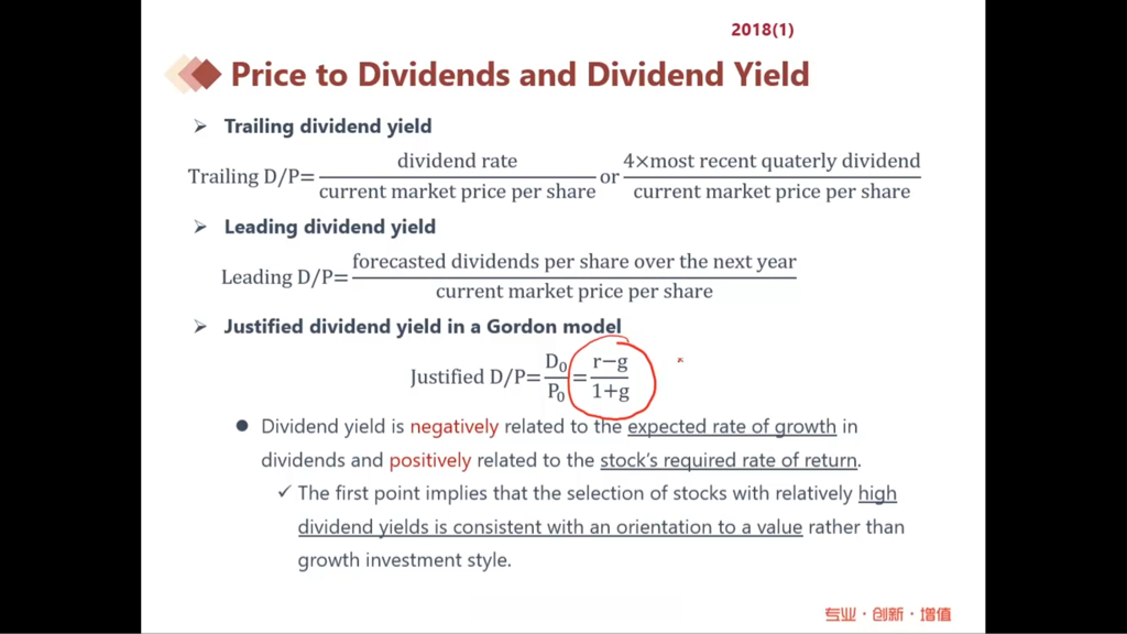 老师好。关于Justified这里有点混淆了。P/E、P/S计算中都是会区分是leading还是 trailing。P/B和D/P计算时justified就是用trailing来代替了吗?