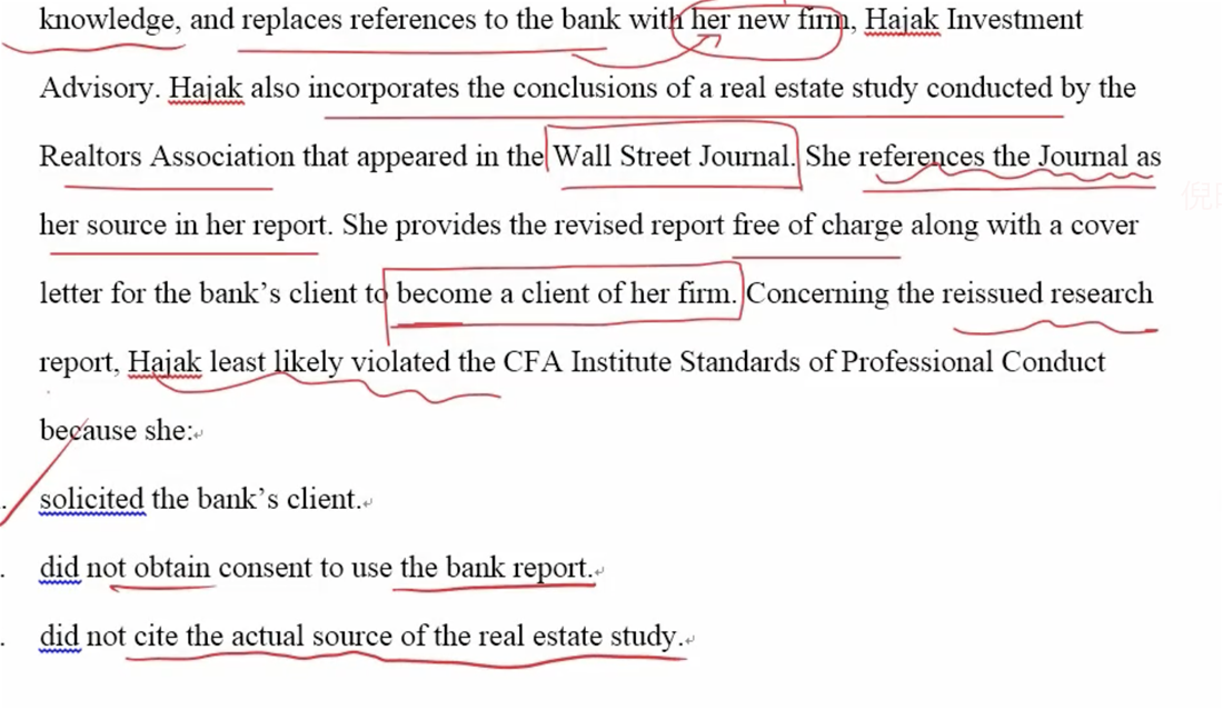 老师好!这道题视频解析老师对于C选项的讲解是不是不太对啊,C选项应该是指那个real estate的study没有充分引用,主人公只引用了wall street Journal,但应高要引用原作者名+媒体刊物名称,这里主人公未引用Realtors Associtation,所以存在违规,是这样吗?