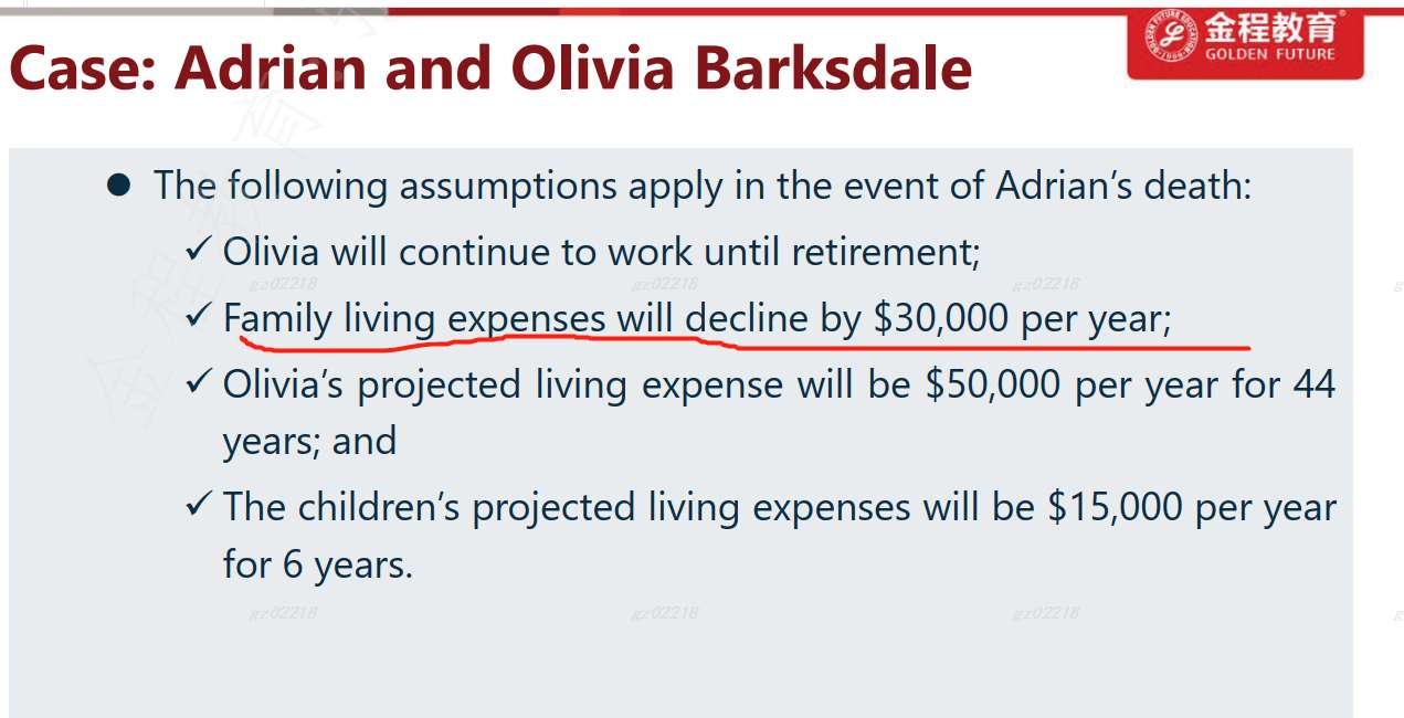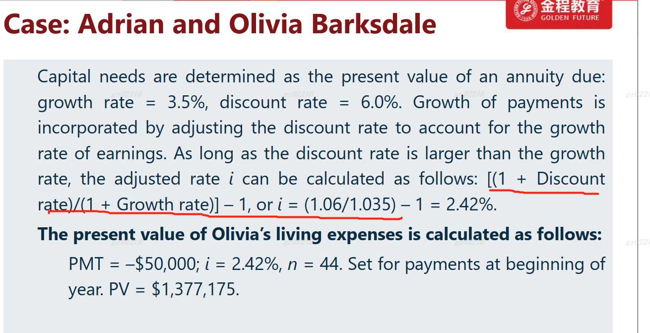 道题的做题思路帮忙讲下老师,另外标记的那个两个式子计算出来的值不一样呀,第一个计算是1.06*1.035-1=9.71%,家庭生活费每年decline30000没有考虑在内呀?为什么没有算Andrian salary190000呢