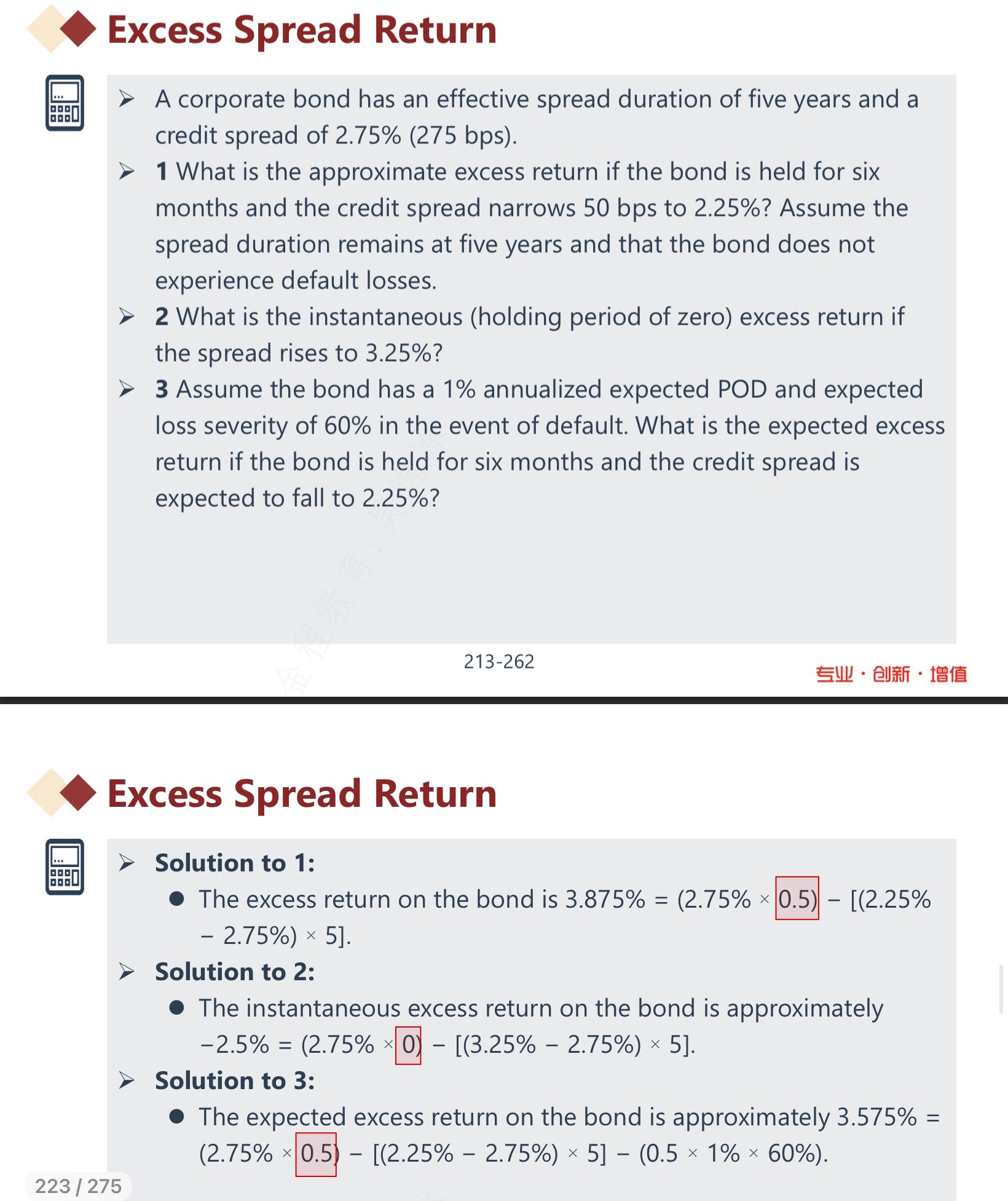 这道题涉及年化问题,为什么计算expected excess return时,第一项spread0和第三项credit loss时涉及年化,而第二项-dealt s乘SD时不涉及年化问题?