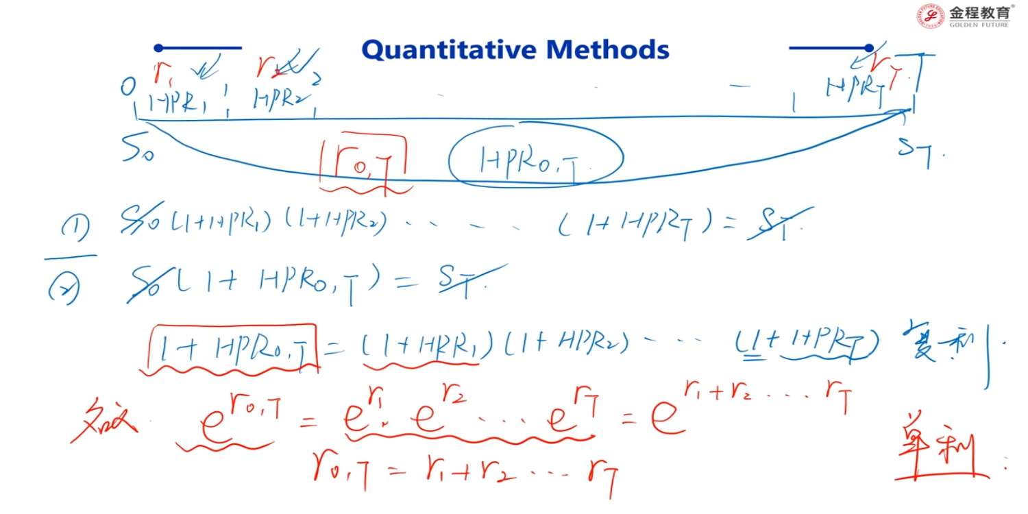 这里有些糊涂,自然常数e的n次方是求解连续复利,和之前讲HPR到现在都是讲收益率的,怎么又出现了名义利率?名义利率是通过通胀率和实际利率相关的利率,和单利复利有什么关系?这里老师讲的名义利率一般是单利,实际利率一般是复利,是原版讲义内容吗?感觉有点牵强。