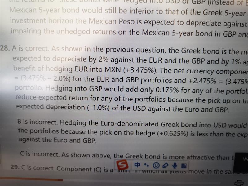 R20原版书后习题28小题,答案的解释不太明白,这里不是已经都hedge了,那么即使墨西哥比索贬值,但是最终获得的还是hedge benifit /cost,为什么说net currency component是用hedge benifit 3.475%减去贬值率1%和2%呢?