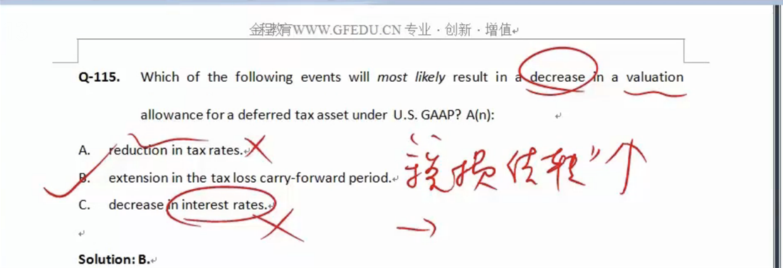 老师好!这道题的B选项还是有点不太理解,首先,valuation allowance是DTA的备抵账户,当DTA未来回转的可能性降低时,valuation allowance会增加。此题的B选项,税损回转,应该就是以前年度亏损可以抵税的意思,当以前年度亏损延长,不就是代表公司的盈利能力减弱,亏损加大吗?亏损变大就用不着DTA来抵税了呀,那valuation allowance不就应该increase吗??