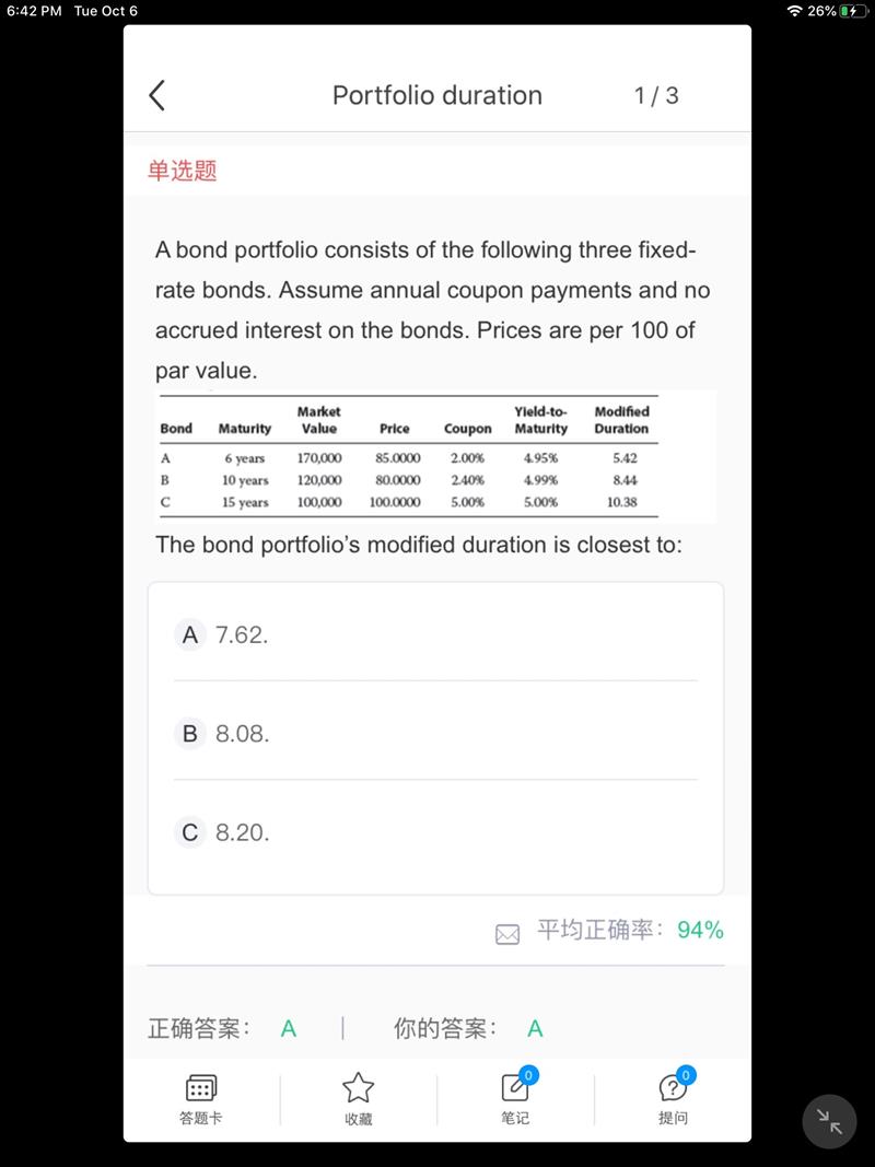 老师 这一题如果要转 macaulay duration 的话 分母那个 yield 怎么写呢? Bond A: (1+4.95%) 还是 (1+4.95%)^6 呢? Bond B&C同理