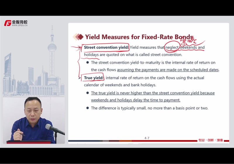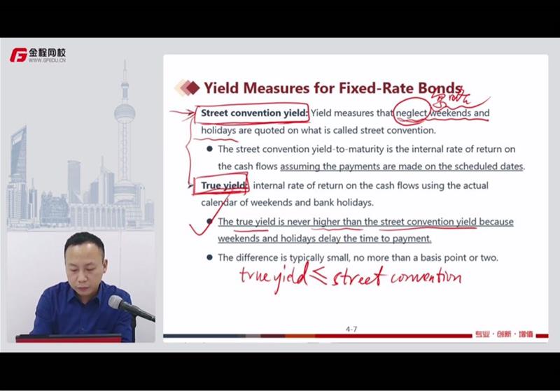 啥意思啊, street yield 就是 holiday weekend 也算coupon,但是 如果 payment 在 holiday上,就递延。true yeild 是所有的周末和节假日都不计息吗