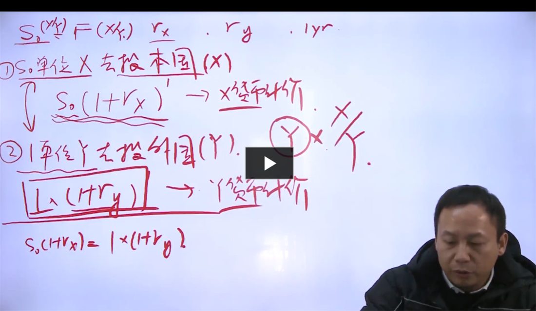 这个公式推导我有几个地方不太明白,首先So应该表示的是spot price,那么在So的时候,X去投本国的时候,不应该是X0(1+Rx)吗,因为So代表的是X/Y,所以So(1+RX)就不太明白为什么这么写,第二个地方不明白的是1单位Y投资1年,不应该是1(1+Ry)那这里的Y去哪里了,为什么用1表示呢?
