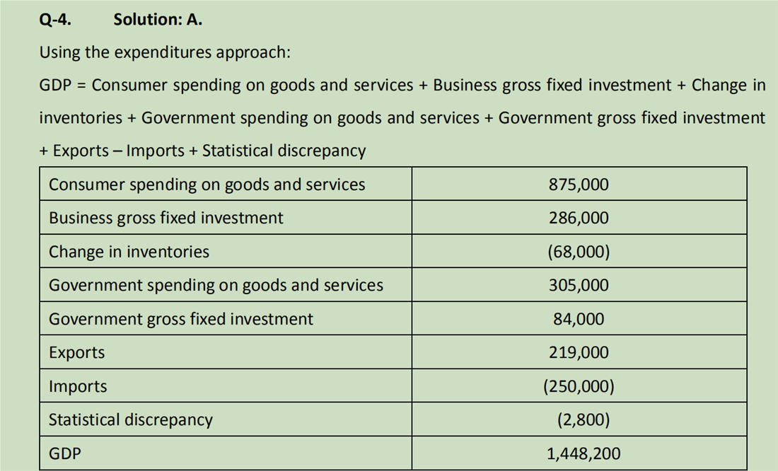 Q4 这道题让我很疑惑的地方在于,题目问的是支出法求GDP,但是答案用到的factor包括statistical discrepancy是收入法公式里面的factor,就比较奇怪。还有就是为什么change in inventories和government gross fixed investment 也要算在内呢?是否可以理解为凡是属于Investment 和Government新增的都要记入GDP?