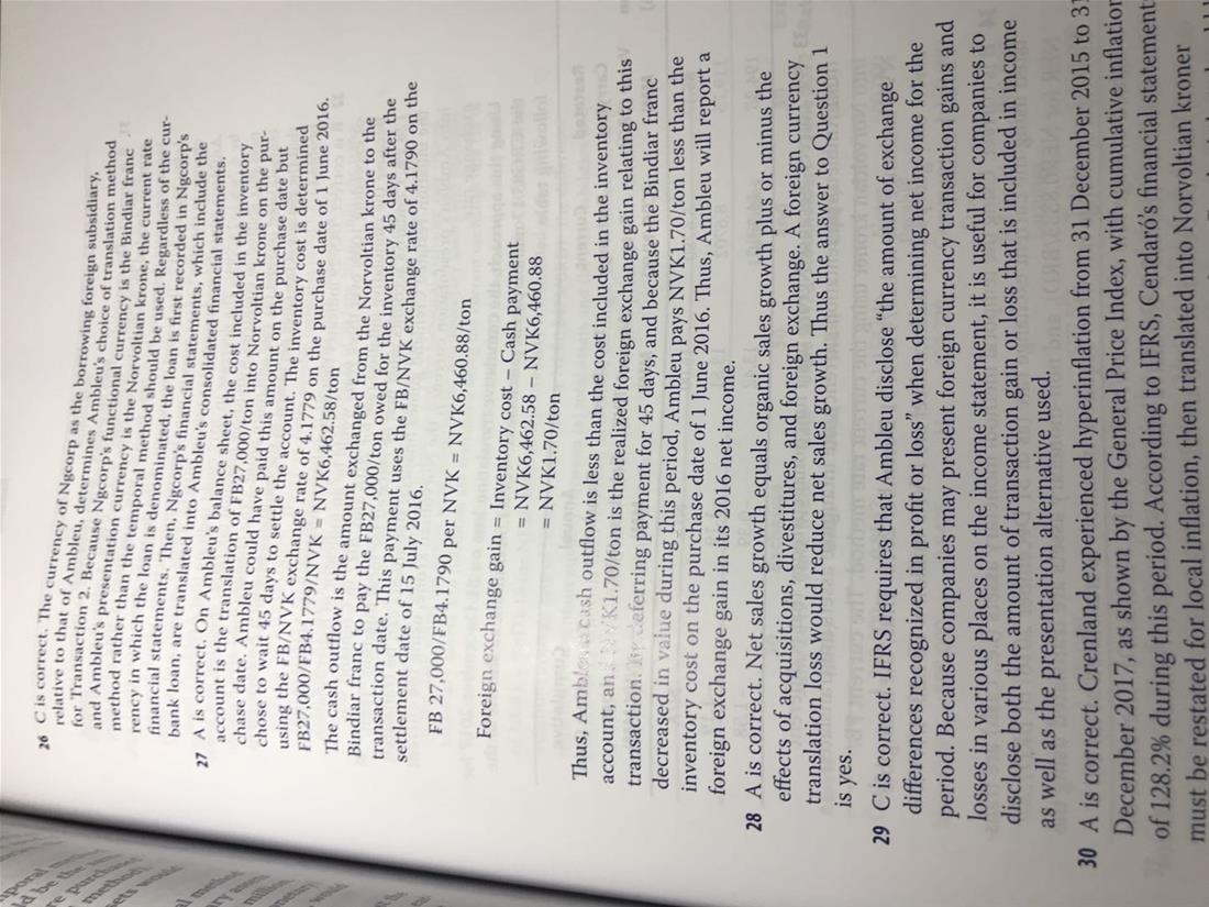 已回答第15章课后习题第26题和第29题。 第26题中,Ngcorp公司于2016年6月1日从银行获得了以Bindiar法郎计价的贷款。由于母公司使用的是现汇法(C.R.),所以对Ngcorp公司相关报表的折算依然以Ngcorp公司所在国货币Bindiar法郎为准。但选项A(贷款计价所用货币)和选项C(借款人所借出资金的计价货币)都是Bindiar法郎,所以我觉得这两个选项没有什么不同。 第29题,我觉得三个选项都不对。发生严重通胀的国家是Cendaro公司所在国,而不是Ngcorp公司所在国,所以选项A错误。由于Ngcorp公司的功能货币(FC)和当地货币(LC)相同,所以Ambleu公司在折算子公司Ngcorp公司的报表时需要使用现汇法(C.R.),因此所有资产都需要用期末汇率(Current Rate)折算(因此选项B错误),且外汇折算损益需要被报告于资产负债表(B/S)而非利润表(I/S)中(因此选项C错误)。正确答案是C,也就是foreign exchange differences可以被报告在利润表中。莫非foreign exchange differences和translation G/L不是一个东西?
