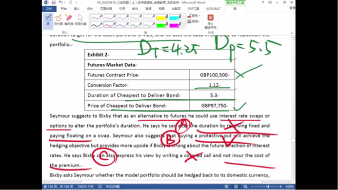 这题我觉得c选项也是正确的,因为降duration说明利率未来上涨,债券价格要下跌,此时买covered call 肯定不对的,但是题目为writing covered call,这相当于卖掉没用的来赚取premium难道不可取吗,就好像bull or bear spread 我们不是卖掉没用的执行价位期权去赚取期权费吗