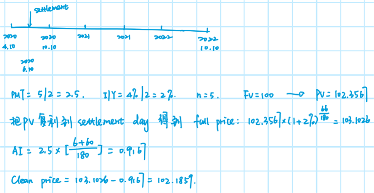 老师,根据课堂上的公式clean price = full price - accrued interest, full price = PV of future cash flow,这里为什么是加?如果说折到PV的时间点不一样,一个用加一个用减,那原版书课后题这里的答案计算起来也不match啊,在2020.04.10的PV是102.3567,加上AI = 0.9167,并不等于settlement date full price 103.1026,这个怎么理解?