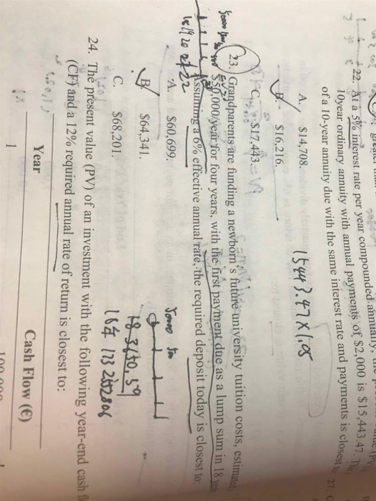 请老师看一下23题 此题从18年开始 应该是一个先付年金 求 pv 吧? 然后 再计算后付年金 求从0到18时刻 的pv? 题干中 这个with ……是什么意思? 我这样算好像没有正确答案