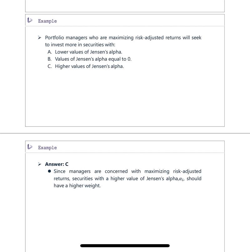 已回答Jensen‘s alpha不是actual portfolio return跟risk-adjusted return之间的差么,那risk-adjusted return要越大的话不应该是alpha越小么
