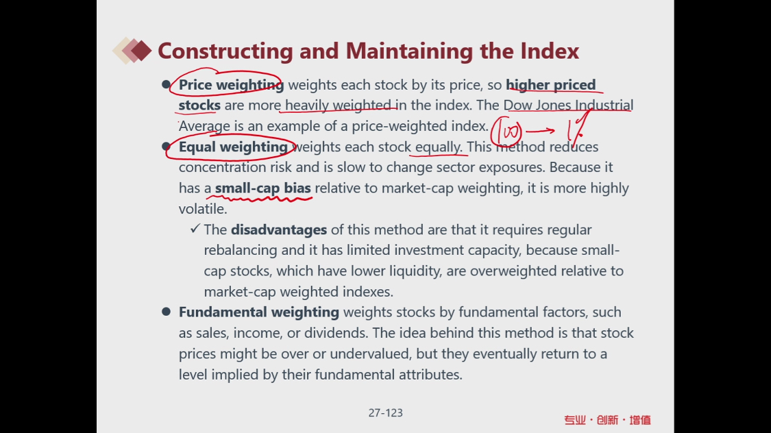 我个人认为,price weighting应该是biased 高价股,高价股多为成长股,所以bias成长股。而老师讲的是偏向高价股,而小盘股一般价格高,所以偏向小盘股。我觉得两者还是不一样吧?