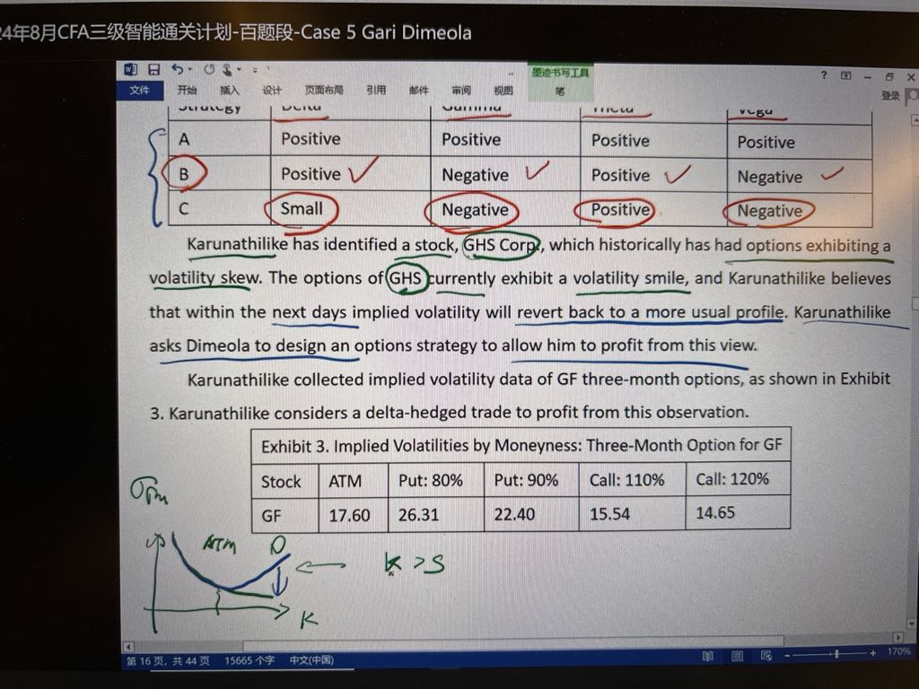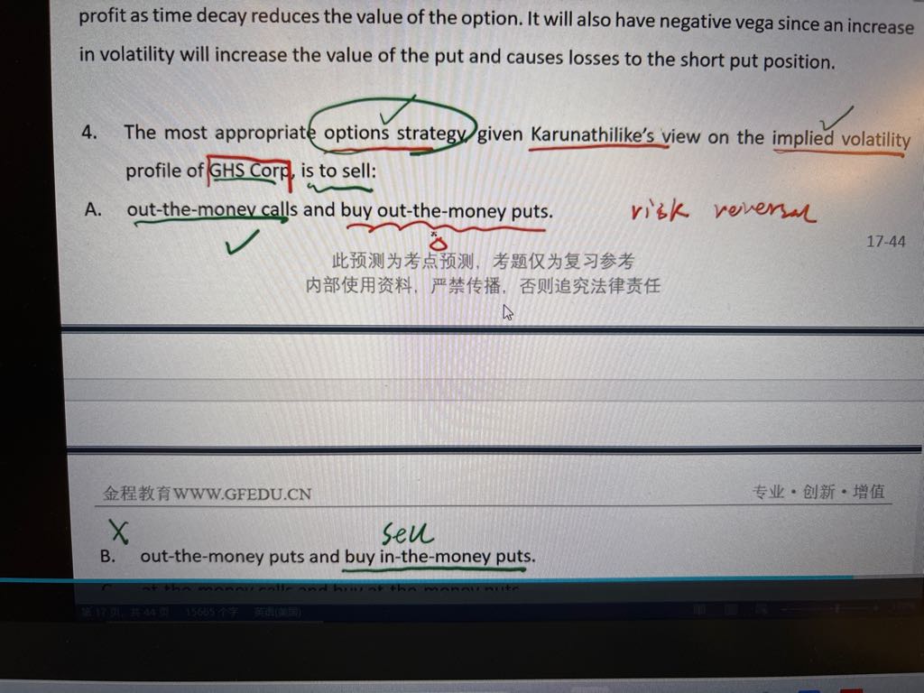 老师,这个题思路老师的我听不太明白。我思路是,现在是smile,后面会回归skew,所以就执行跟skew时候反的策略就行…skew是long risk revesalC-p,所以这个是p-c