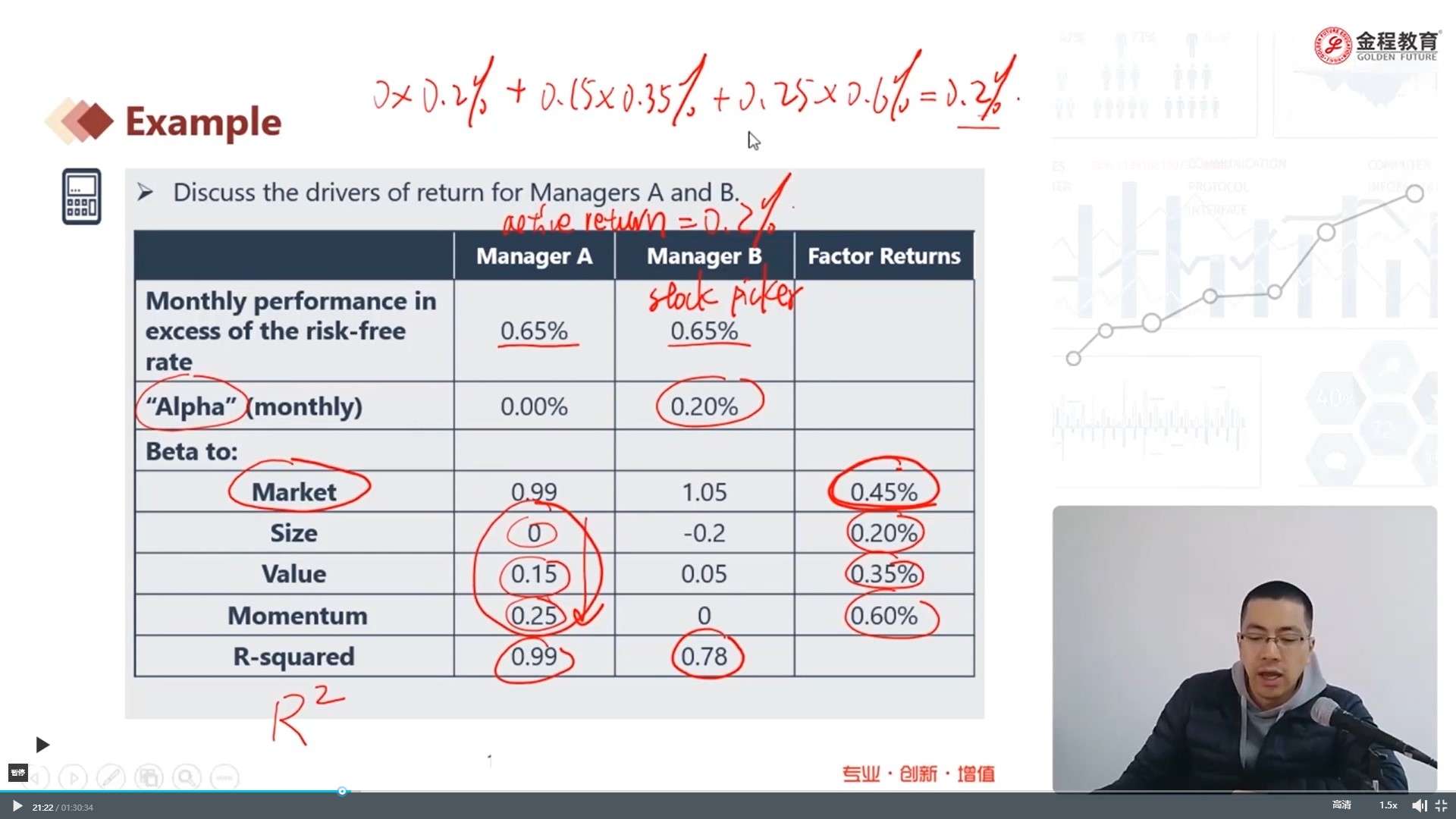 老师,图中的0.65%是超过无风险利率的部分,而factor returns(market)(能否理解为benchmark?)并不是超过无风险利率部分,是否题目不够严。若题目告知无风险利率Rf,是不是应该用0.65%+Rf-0.45%才是active return?