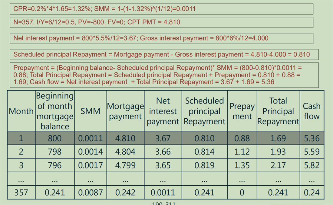 关于附件中的这道题,我有几个概念,希望老师帮我解释一下: 1、在提前还款中,CPR是年化利率,但是在计算公司的时候CPR=0.2%是第一个月,CPR=0.2%*2 是第二个月,把年化利率和月份相乘,这个计算公司对吗? 2、当WAM=357, CRP=0.2%*4*1.65, 这里为什么用4?老师讲的是因为总共360个月,但是题目中并没有说总共好多个月。 3、CRP 和 PSA 一个是年化,一个是月,怎么解释两者的换算关系?可否理解为CRP/12=100PSA? 4、最后cash flow的计算公式为什么没有包含付给第三方的0.5%的值呢?这个也是cash flow