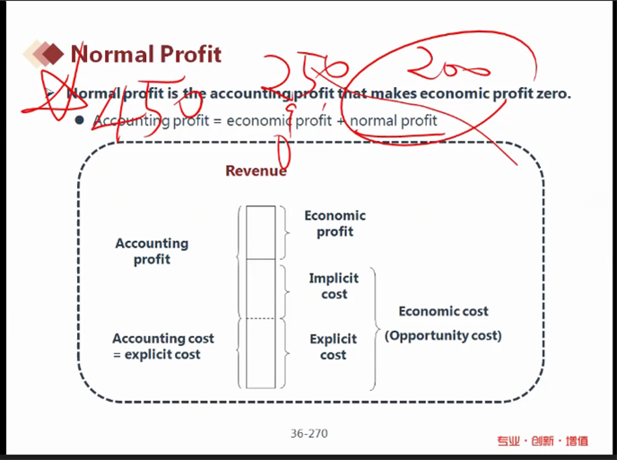 第一张图中,这个implict cost就是隐藏的成本的意思吧?但怎么是oppotunity cost(机会成本)=implict cost+explict cost(即accounting cost)呢? 第二张图中,超额利润=收入-accounting cost-oppotunity cost。如果按上述的公式,这个超额利润=收入-accounting cost-oppotunity cost=收入-accounting cost-(implict cost+explict cost),而按照图一,explict cost即accounting cost,那么上面的公式就变成了超额利润=收入-accounting cost-(implict cost +accounting cost)=收入-2*accounting cost-implict cost,这明显不对啊