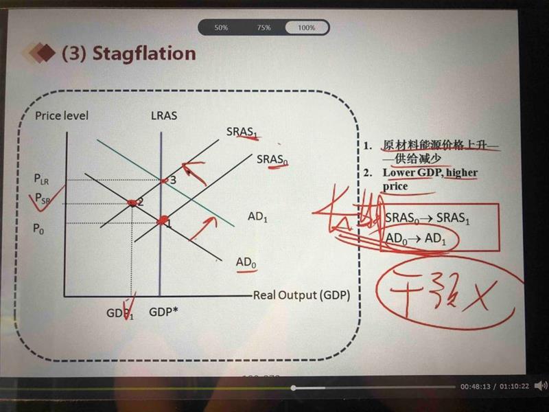 讲义的128页,视频的47分40秒左右。 老师说到是原材料能源价格上升导致供给减少,然后AS曲线左移,此时P上涨,AD却减少。 待长期过去,它会慢慢自动平衡,AD会由AD0增加到AD1,达到新的平衡点3。 那此时的价格明显比之前的P0和PSr都高了。 但是题目讲解中说的自动平衡是P会回到P0。 这两者直接有矛盾吗? 这个自动平衡到底是哪一种?