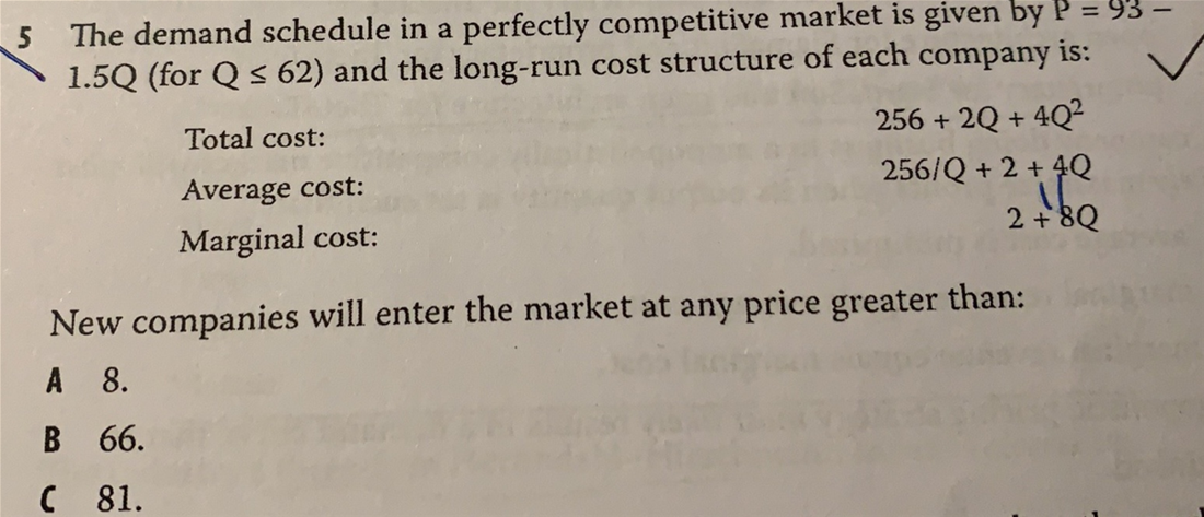 老师请问一下,这个知识点应该对应的是这道题。长期均衡无超额利润,P=MC=AC这个我知道,就是这个题目给出的需求曲线我不太清楚。1. 题目里算的P=MC=AC是不是指的是厂商,而给出的需求曲线是市场上的。2. 根据长期均衡P=Q=MR=MC=AC,算出来的P也不等于Q啊?