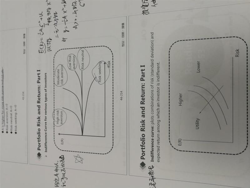 疑问一,上图的效用曲线在纵轴都相交于一点,下图的如果延伸到纵轴是不相交到一个点的,为什么会有这种区别? 疑问二,老师在视频讲到,对于同一个人而言,最喜欢下图最高的那条线,因为同样的风险收益最高,但是对于一个人而言,他自己的风险厌恶系数是恒定的,即A是确定的,自己怎么会出现三条效用曲线? 疑问三,马可维次理论中客观世界和主观世界的切点,我理解不了是怎么得到的,一个人的效用曲线就一条,万一不和有效前沿相切,不就没有切点了吗