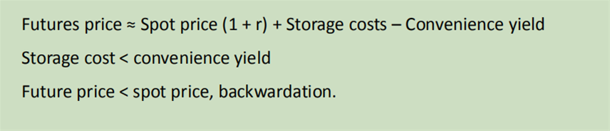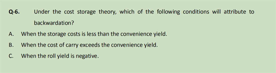 什么是convenience yield (持有期到期收益)的计算公式和解释? 如果convenience yield 大于storage cost,那么future price 应该高于 spot price, 应为future 更值钱?但是答案选择A, SP>FP