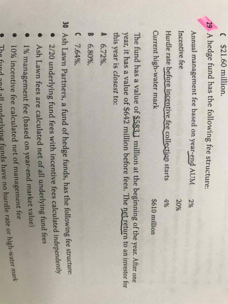 关于基金收费的计算,一直不太理解high-water mark,这个历史最高点的值,怎么定义,就是指哪个时间段的最高点。比如29题。 该题年初是583.1,当年年末是642,那这个610是在之间某个时点出现的吗? 为什么用610这个基数去计算hurdle rate,而非使用583.1。 我对hurdle fee的理解是,当年return的某个百分比,那此题的return 不是(642-583.1)吗? 辛苦老师解答,谢谢